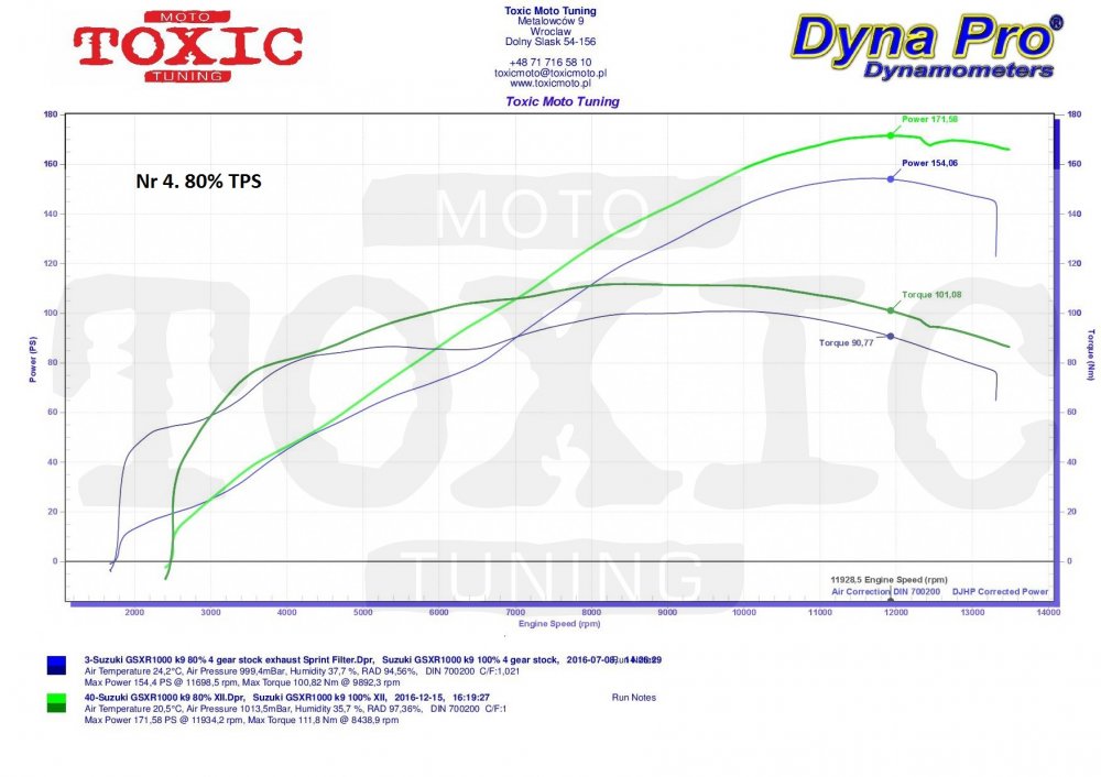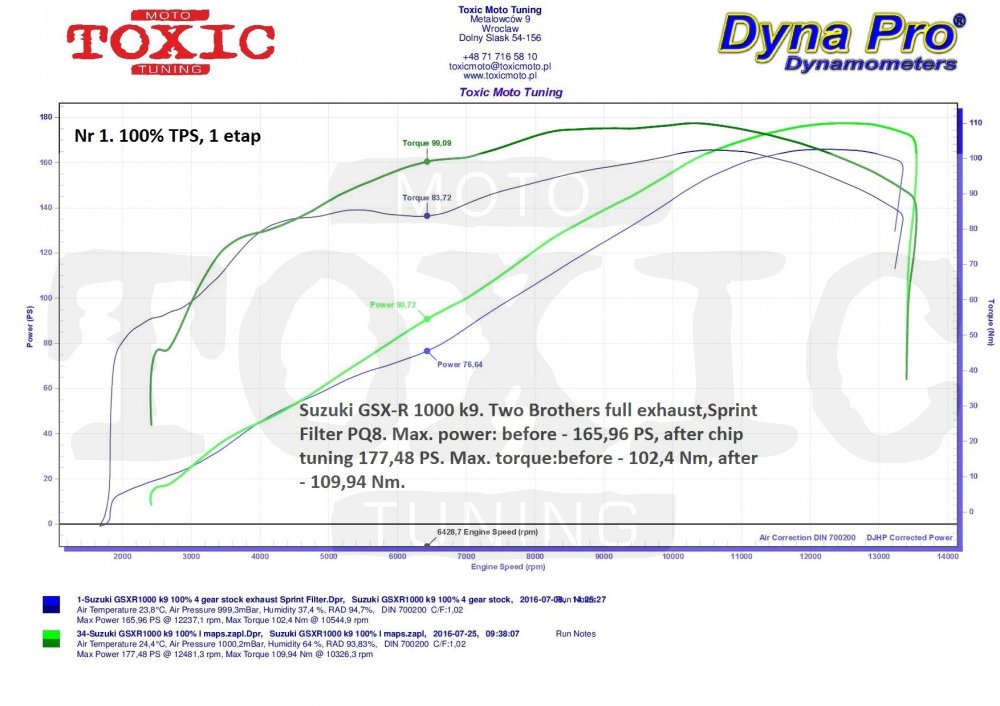 Poza tym: zmiany w mapach paliwowych, zapłonowych, drugich przepustnic, eliminacja TRE, ogranicznika prędkości maksymalnej itp. Zamontowaliśmy quicshifter, którego pracę koordynuję oryginalne ECU motocykla. Przy okazji lunchu control z pewnością pozwoli na bardziej efektywne ruszanie ( mamy nadziję, że nie tylko spod świateł na skrzyżowaniach)