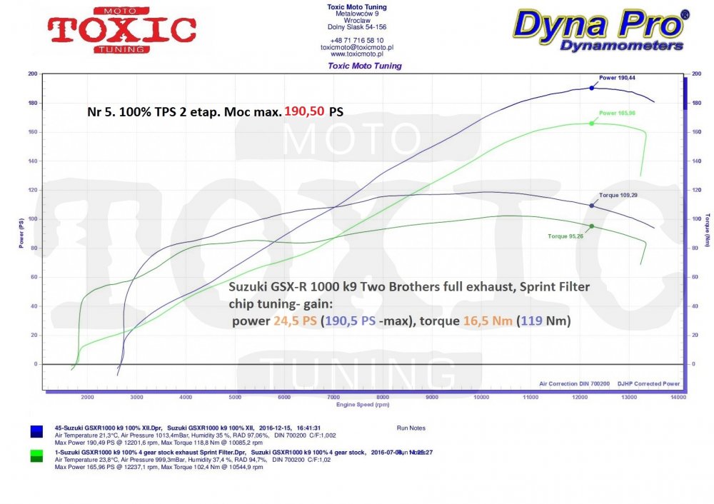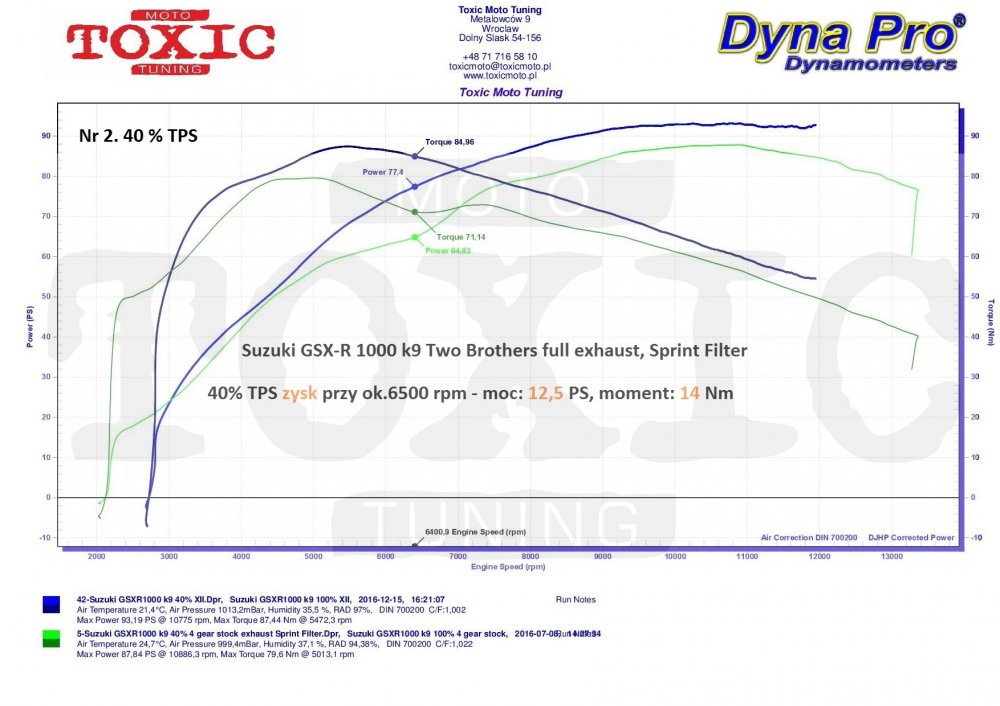 Wymieniono w nim układ wydechowy na kompletny firmy Two Brothers, filtr powietrza Sprint Filter, który zagwarantował lepszy przepływ powietrza. Usuneliśmy exup oraz zablokowaliśmy dopalanie spalin.