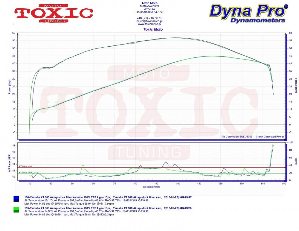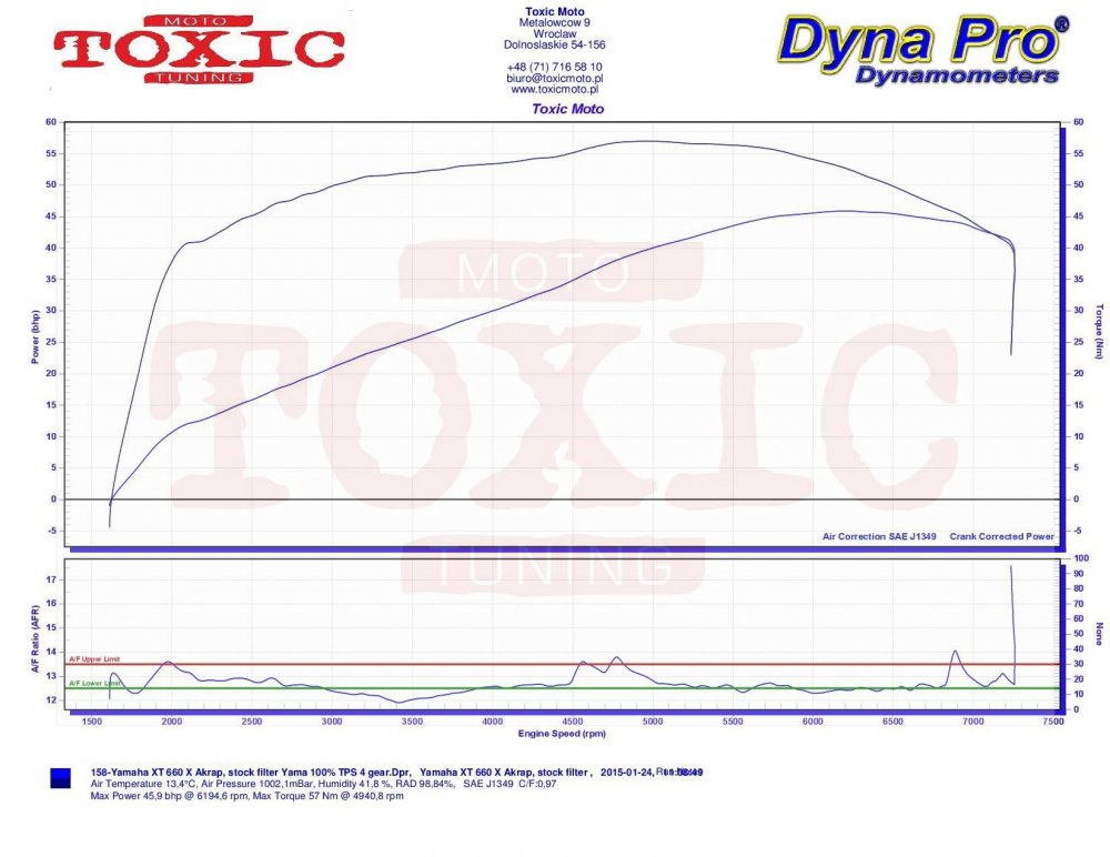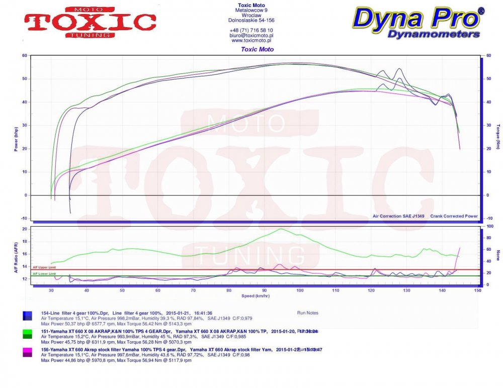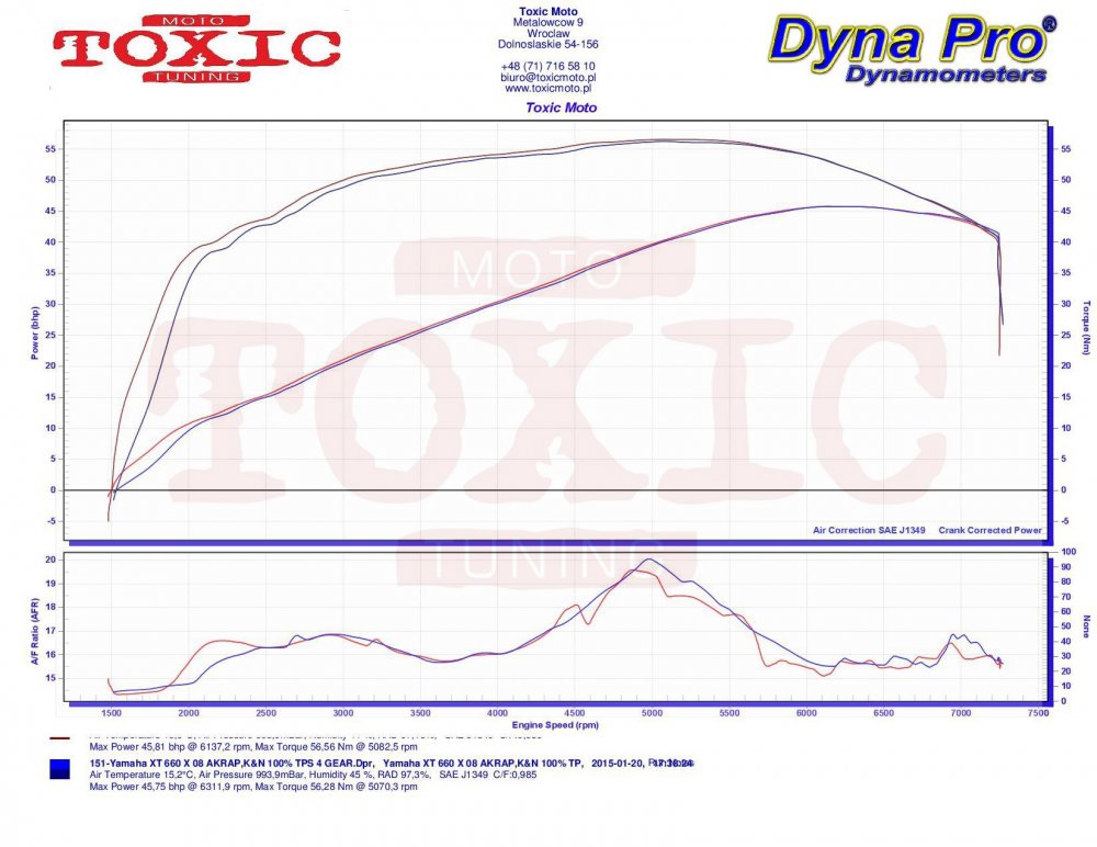 Wykonaliśmy parę pomiarów na naszej hamowni i chcielibyśmy je Wam zaprezentować. Na 6ej miniaturce mamy pomiar XTka z wydechem Akrapovic bez DB killerów oraz filtrem powietrza K&N. Jak widać moc maksymalna czyli niecałe 46 koni oraz niecałe 57 Nm to całkiem porządny wynik, nieznacznie odbiegający od deklaracji producenta (motocykl o przebiegu ponad 45 tysięcy! Najciekawszy w tym pomiarze nie jest jednak wykres mocy czy momentu lecz AFR. W zasadzie od ok. 2 tys. rpm aż do końca mamy do czynienia z bardzo ubogą mieszanką dochodzącą aż do 20! Jak jest z temperaturą spalania przy takiej mieszance każdy chyba wie. Najtańszym sposobem by powrócić przynajmniej w pobliże normalności okazało się założenie najgorszego filtra powietrza tzw. zamiennika oraz DB killerów. Jaki efekt? Można zobaczyć na przykładzie pomiarów przedstawionych na miniaturce pierwszej i czwartej. Pierwsza miniaturka pokazuje różnicę pomiędzy pomiarów z trzeciej miniaturki i szóstej ( pomiar z filtrem M-Line powietrza oraz DB killerem). Jak widać uzyskaliśmy nawet wzrost mocy maksymalnej choć w zupełnie przypadkowy sposób. Z pierwszej, drugiej i siódmej miniaturki widać, że mocy ubyło przy zastosowaniu DB-kilerów w dolnym i średnim zakresie obrotów. Normalne w końcu choć nieoczekiwanie otrzymaliśmy wzrost mocy maksymalnej w przypadku zastosowania najgorszego filtra powietrza. Można powiedzieć, że wypadki przy pracy się zdarzają :) . Miniaturka czwarta to pomiary z wydechem Akrapovica z DB kilerami oraz filtrem powietrza Yamahy. Miniaturka druga jest porównaniem 3 pomiarów: Akrapovica z K&N bez DB killerów, z DB killerami przy filtrze powietrza M-Line i oryginalnym Yamahy. I ten ostatni uważamy za najlepszy przy założeniu, że nie chcemy nic zmieniać w wyposażeniu akcesoryjnym motocykla. Osobiście uważamy, że najlepszą opcją aby uzyskać maksimum potencji silnika byłaby regulacji map paliwowych oraz zapłonowych poprzez moduł Rapid Bike Racing oraz modyfikacja air boxa.