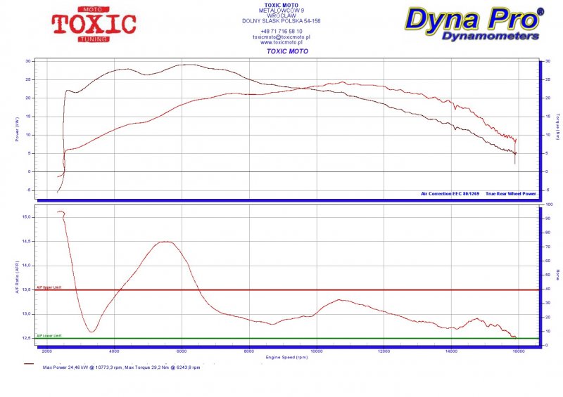 According to the Polish law it is impossible: if the biker has A2 driving license, he can ride only on bikes with no more than 35kW, which have been cut down from bikes with no more than 70kW in basic versions. It means that young biker cannot ride on the bikes with let's say 100kM in basic versions. Is that good or bad? It seems that the polish know-it-all legislation guys are yet again forcing their own visions upon us, without any solid reasons to back up their actions. Below we can all see a dyno for the bike, which in case of Germany, would be allowed on roads,whereas in Poland it is forbidden to ride on such dangourous vehicles :) Of course the blockade is confirmed with the official stamp from German's TUF.