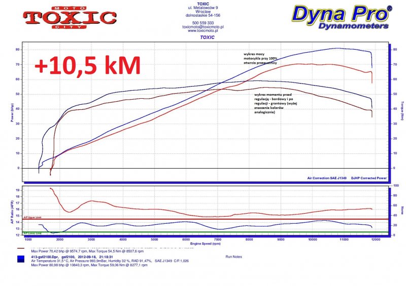 Auf unserem Motorprüfstand setzten wir den Motorrad Suzuki GSF 650 vom Baujahr 2008 auf. Zur Prüfung nahmen wir den Tuningmodul „Power Commandere III”, dazu noch den „Tensometric-Quickshifer” vom Herrsteller namens „Dimsport” (stellt auch die „Rapid Bike”-Tuningmodule her”). Der Tuning der Kraftstoffkarten in allen möglichen Konfigurationen ergab beeindruckende Ergrbnisse: zusätzlich 10 PS und Drehmomenterhöhung von 54,5 Nm bei 8507 RPM auf 59 Nm bei 8277 RPM. Die roten Kurven stellen die Werte vor dem Tuning dar, die blauen danach. Das Diagram betrifft der 100%-Drosselklappeöfnung im 4 Gang.