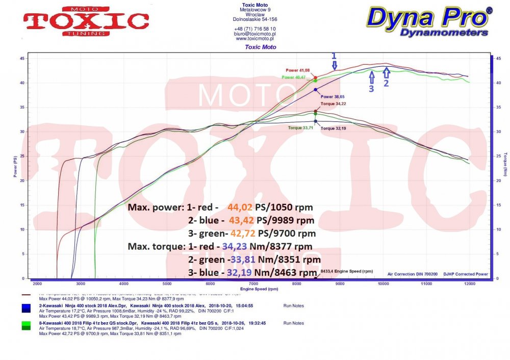 Prezentujemy poniżej wyjsciowe pomiary trzech egzemplarzy Kawasaki EX 400 Ninja 2018. Wszystkie mają ten sam - fabryczny układ wydechowy i fabryczny filtr powietrza. Szczególnie ciekawym jest pomiar niebieski i zielony. Okazuje się, że nie zawsze ten co ma większe muskuły potrafi lepiej pracować :)